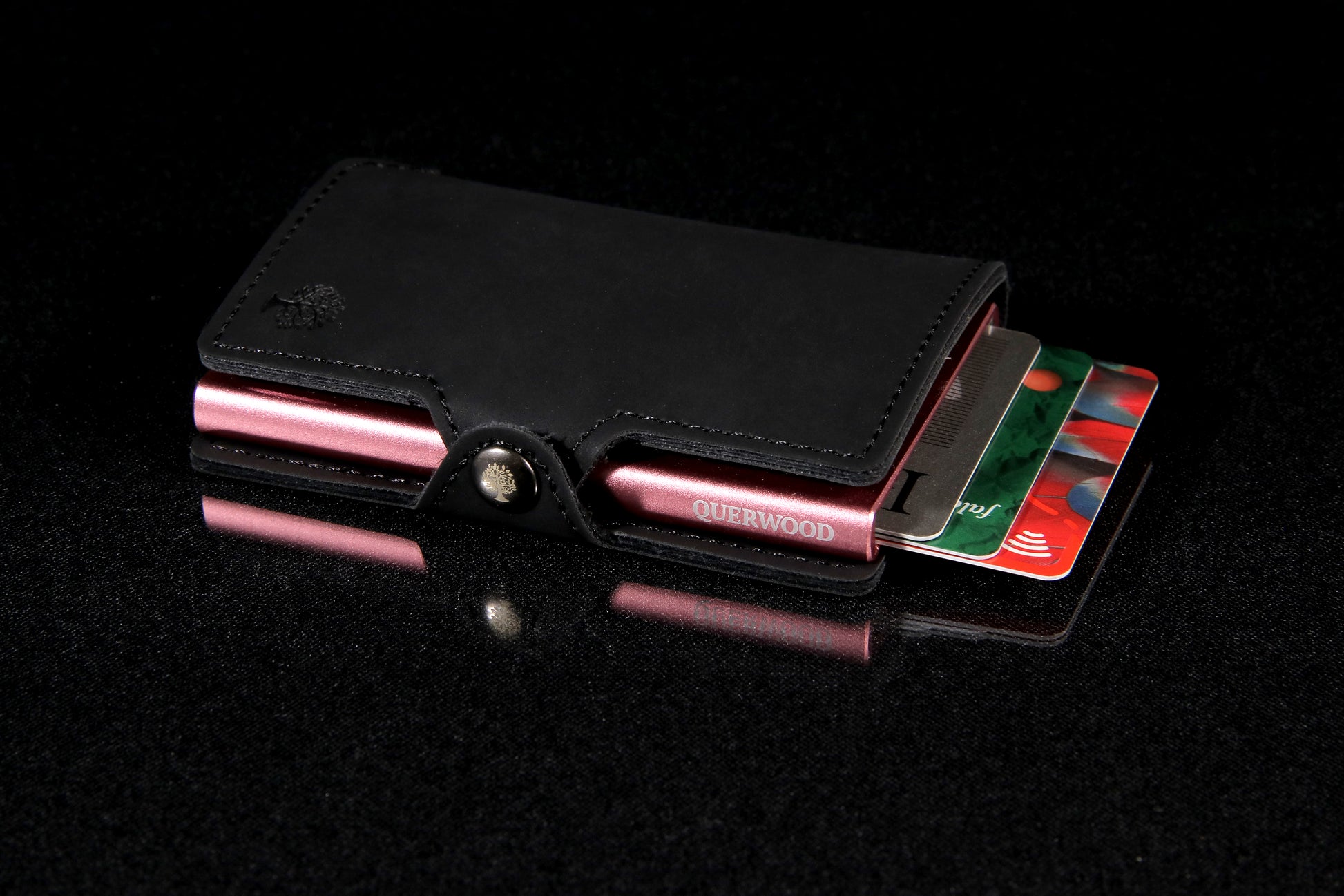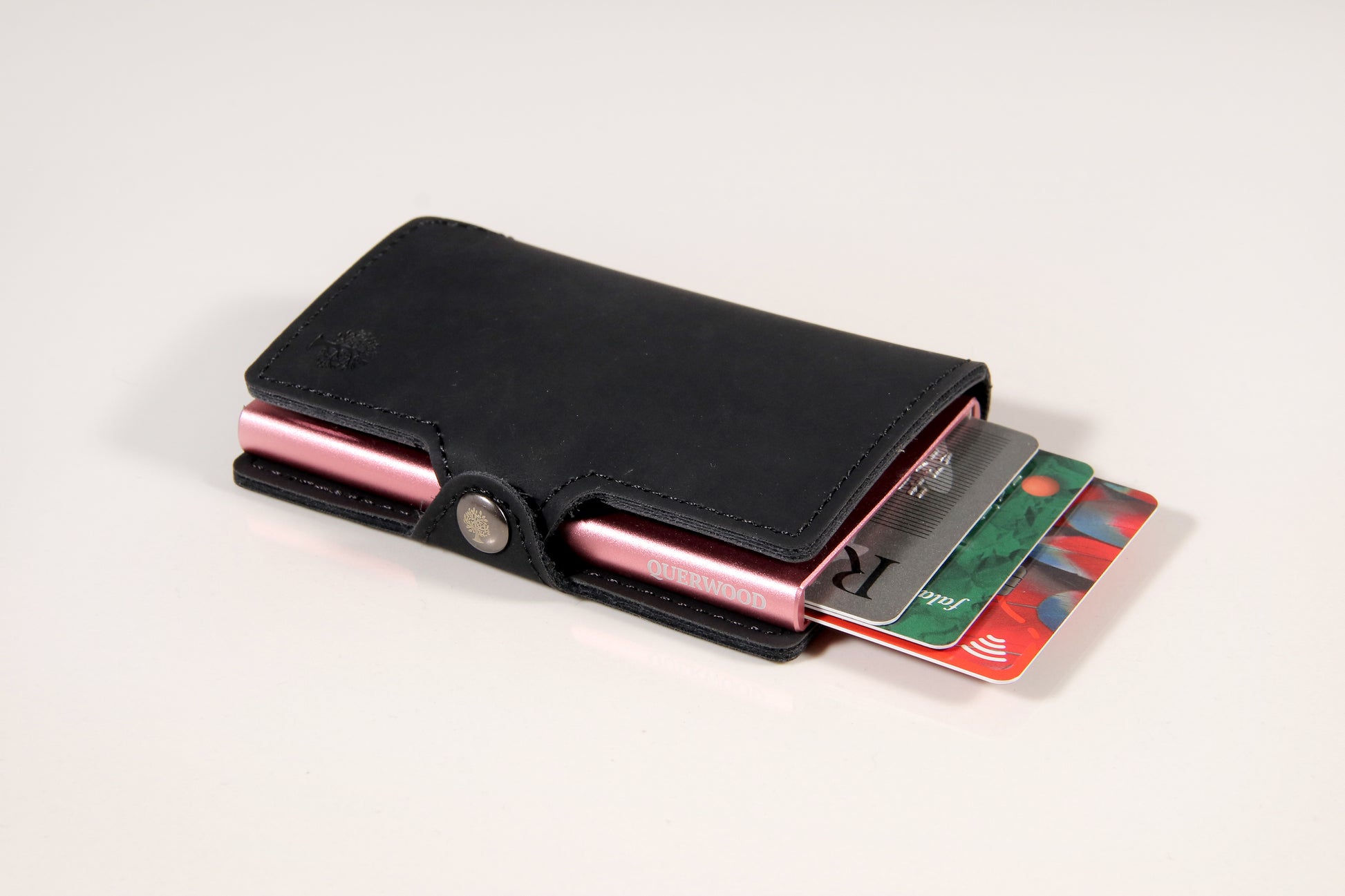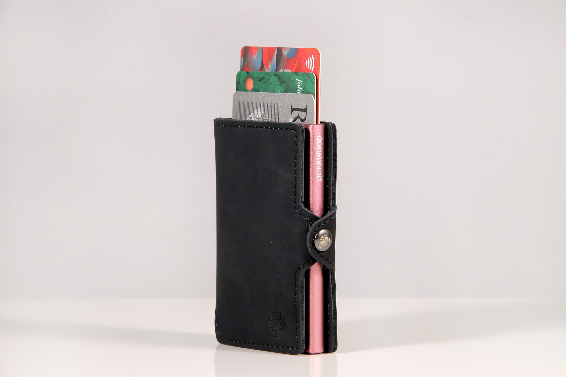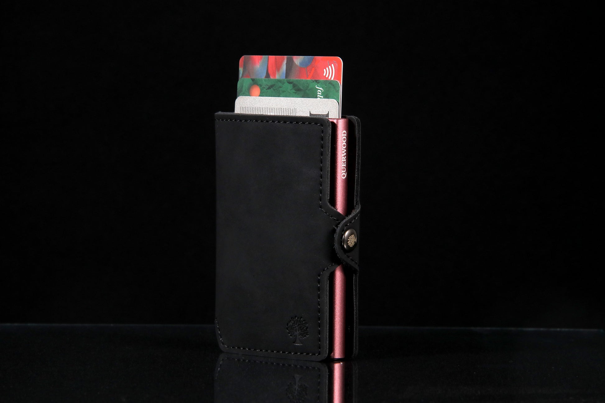 Cuenta con un sistema pusher slim (inyector de tarjetas), que permite extraer tus tarjetas de forma rápida, ordenada y con un solo movimiento. Gracias a su diseño inteligente y medidas reducidas (10 x 7 x 2 cm), es perfecta para llevar en el bolsillo sin abultar.